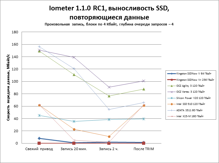 | Iometer 1.1.0 RC1, выносливость SSD, повторяющиеся данные Произвольная запись, блоки по 4 Кбайт, глубина очереди запросов — 4 |