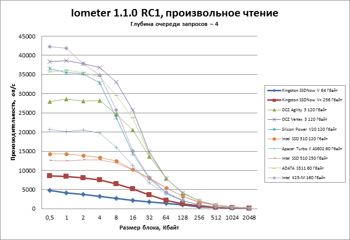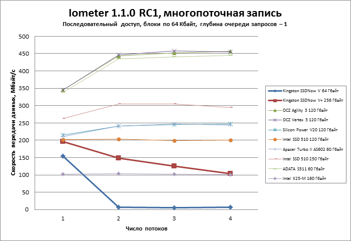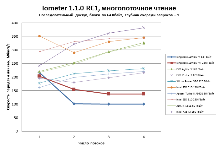 В тесте с многопоточной нагрузкой приводы Kingston также продемонстрировали поведение, нехарактерное для современных SSD, — по мере увеличения количества потоков скорость идет вниз, и если SSDNow V+ сдает позиции постепенно, то SSDNow V резко теряет производительность уже при появлении второго потока.