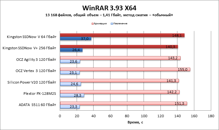 WinRAR рисует аналогичную картину. SSDNow V+ заметно, но не фатально уступает большинству соперников. У SSDNow V дела обстоят гораздо хуже.