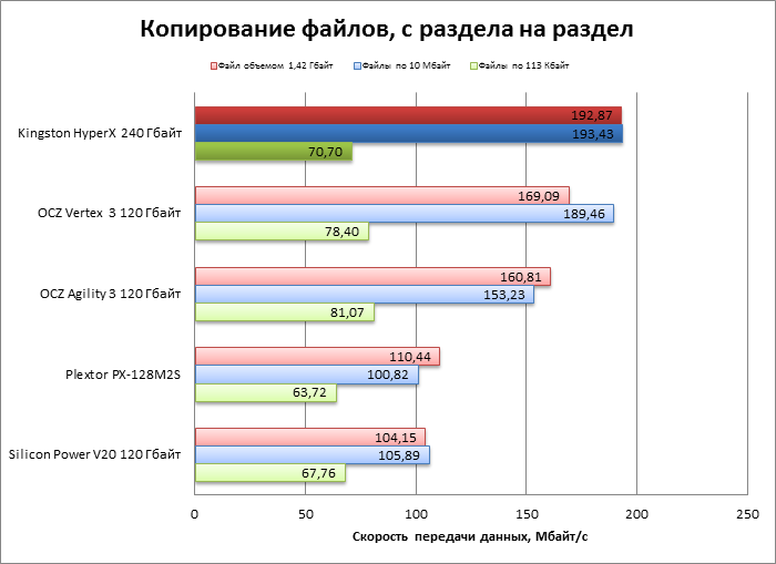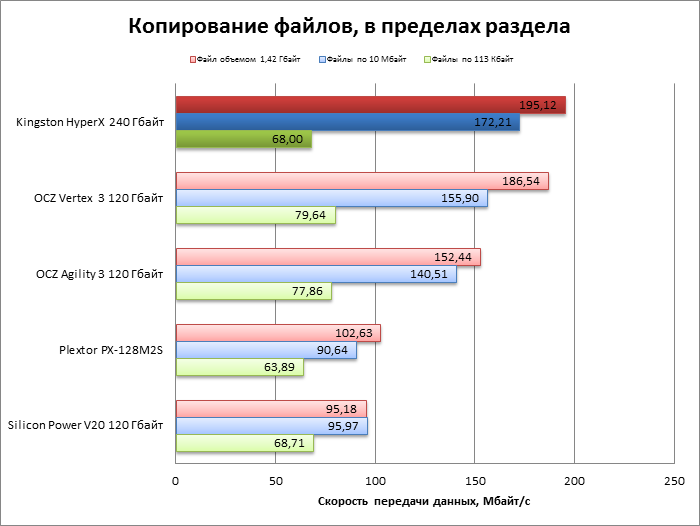 При копировании файлов HyperX объемом 240 Гбайт почему-то хуже справляется с «мелким калибром», чем оба вдвое меньших накопителя OCZ, но вот на крупных файлах скорость резко увеличивается. Все три SSD оставили далеко позади Plextor PX-*M2S, единственного представителя противоположного лагеря, который успел поучаствовать в актуальной версии этого теста.