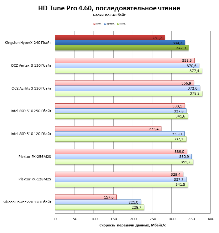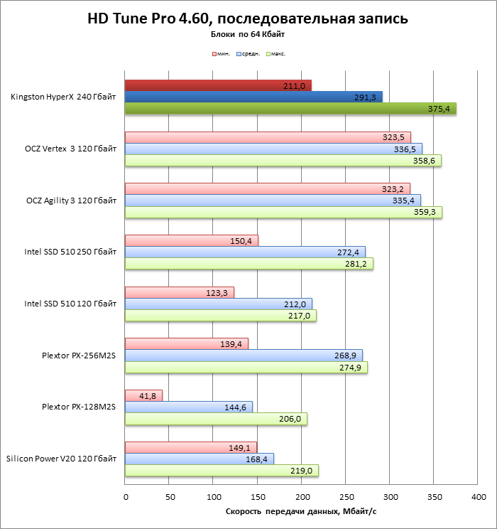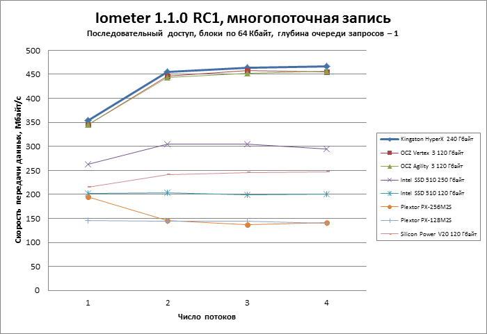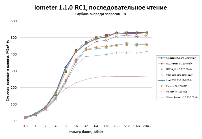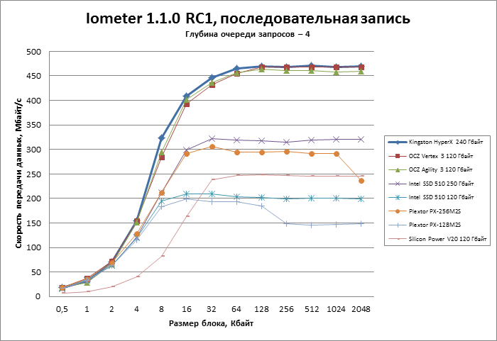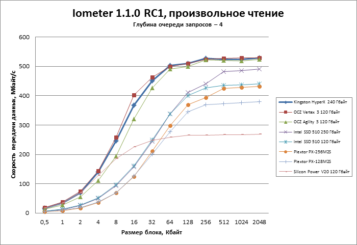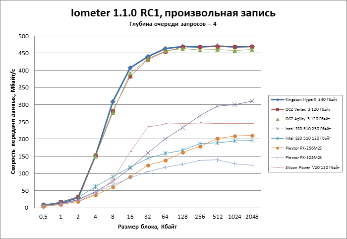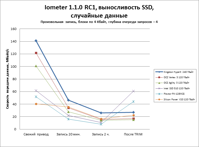 В качестве соперников для HyperX мы подобрали быстрейшие SSD для шины SATA 3: OCZ Vertex 3 и Agility 3, Intel SSD 510, а также Plextor серии PX-*M2S. Для сравнения представлены графики привода Silicon Power V20 на платформе SandForce первого поколения.
