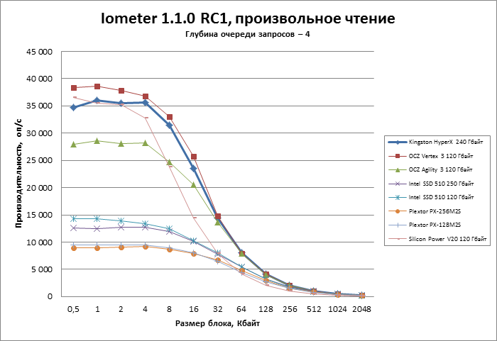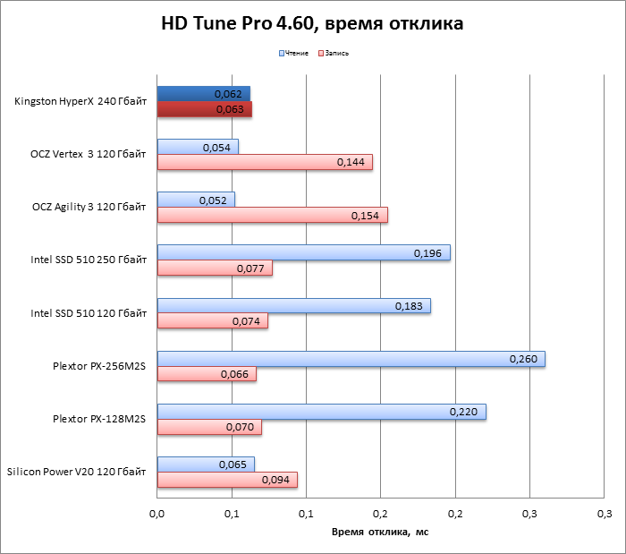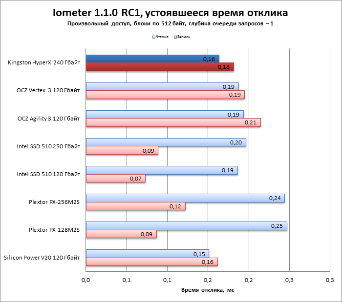 Kingston HyperX оказался несколько более отзывчивым по сравнению со своими прямыми конкурентами — Vertex 3 и Agility 3. Intel SSD 510 и его аналог от Plextor в целом демонстрируют меньшую задержку при записи, зато неповоротливы при случайном чтении мелких блоков.