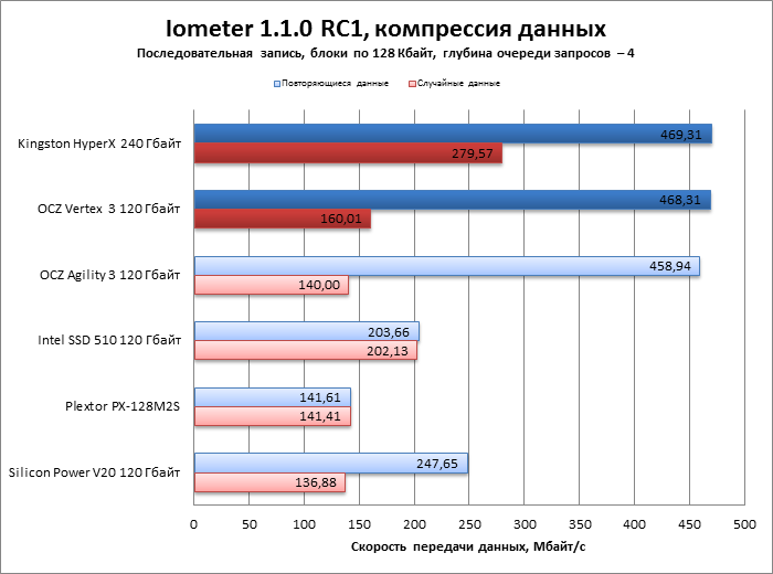 А вот и больное место всех накопителей на чипах SandForce — скорость записи рандомизированных данных. Алгоритм компрессии контроллера настолько эффективен, что при записи хорошо сжимаемого контента реальная пропускная способность flash-массива маскируется и устройство без особых потерь переживает даже отключение половины каналов, как в случае с 60-гигабайтными моделями. Со случайными данными или предварительно сжатыми файлами такой фокус не проходит, и проявляется колоссальная разница между 240-гигабайтным HyperX и OCZ Vertex 3 объемом 120 Гбайт.