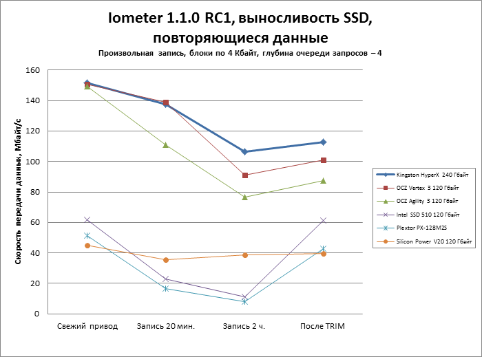 Производительность твердотельного привода падает по мере его заполнения данными. Сохранять форму накопителю помогают компрессия данных и алгоритмы удаления «мусорных» данных. Для оценки эффекта от этих мер мы с помощью Iometer в течение 30 минут бомбардируем накопитель произвольными запросами на запись блоков по 4 Кбайт с глубиной очереди 32. Данные для записи генерируются случайным образом, чтобы затруднить компрессию, которую может выполнять контроллер. Затем процедура продляется еще на полтора часа. У свежего привода и после обоих циклов заполнения измеряется скорость произвольной записи 4-килобайтных блоков при глубине очереди в 4 запроса, с использованием как повторяющихся, так и случайных данных.