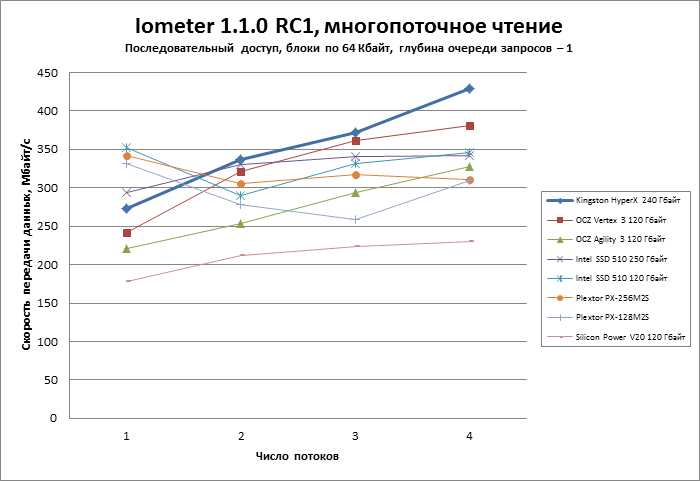 Долгожданный эффект от чередования проявился в многопоточной нагрузке: скорость чтения при четырех потоках у HyperX существенно выше, чем у 120-гигабайтного Vertex 3. При записи разница незаметна.