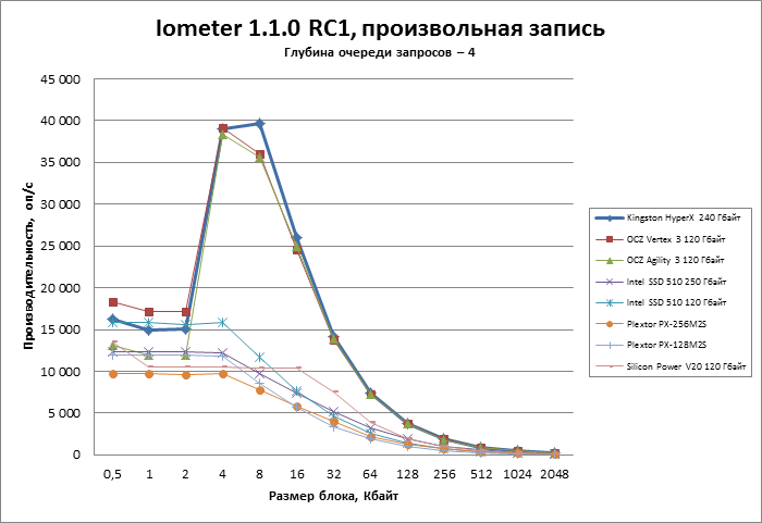 | Скорость произвольной записи, оп./с | 60 000 — устоявшаяся, 70 000 — макс. (блоки по 4 Кбайт) | 60 000 — устоявшаяся, 60 000 — макс. (блоки по 4 Кбайт) |