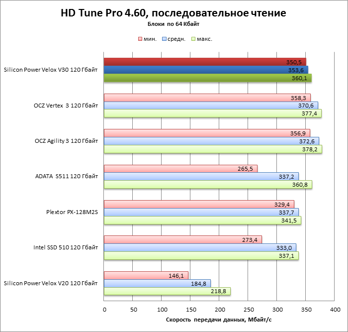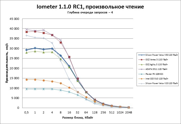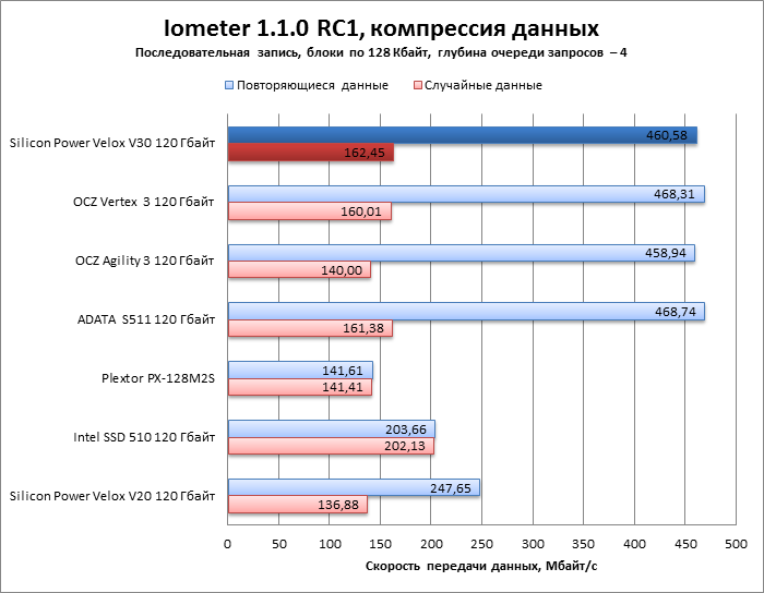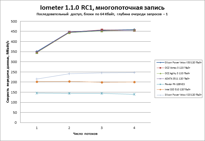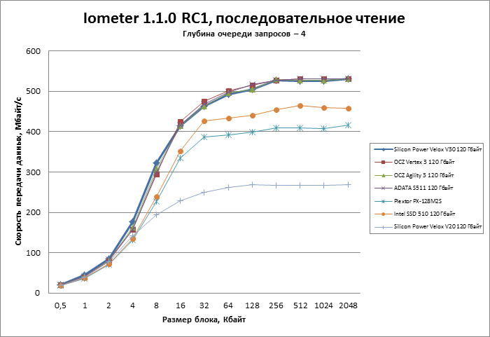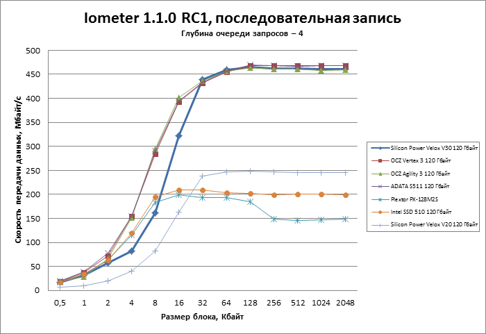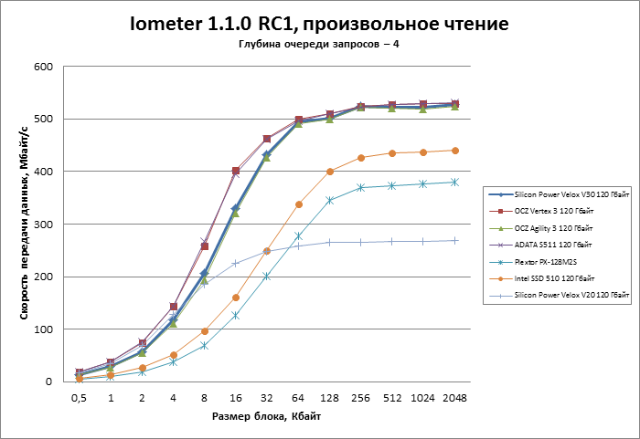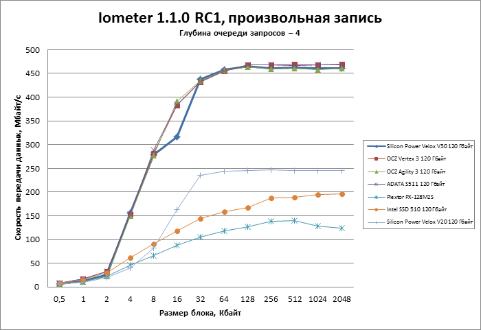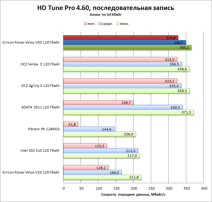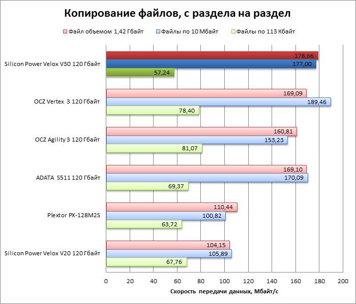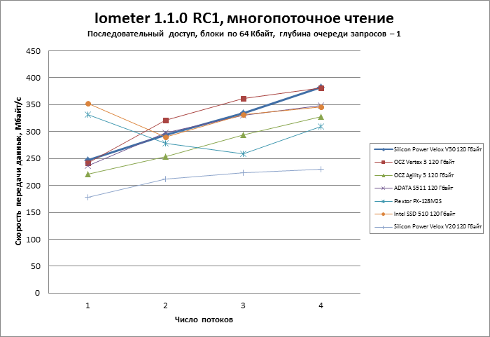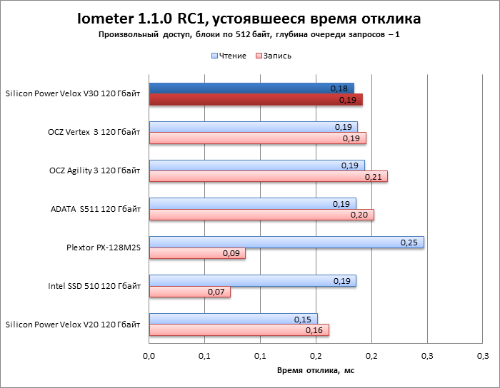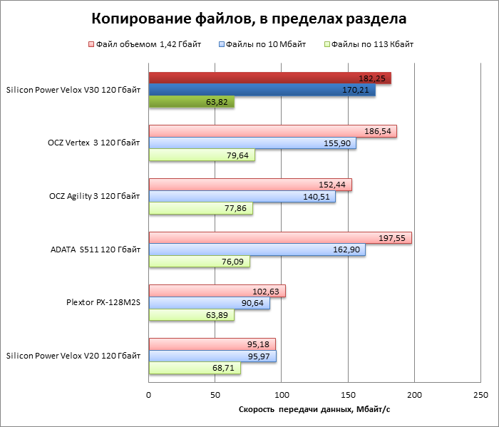 Главное, что нас интересует, — как Silicon Power Velox V30 соотносится по производительности с тремя другими приводами на платформе SandForce SF-2200 объемом 120 Гбайт, которые мы уже протестировали ранее. А для примера приведем результаты накопителя с контроллером семейства SF-1200, тоже от Silicon Power, и двух SSD с контроллером Marvell 88SS9174.