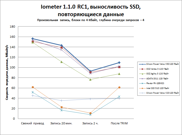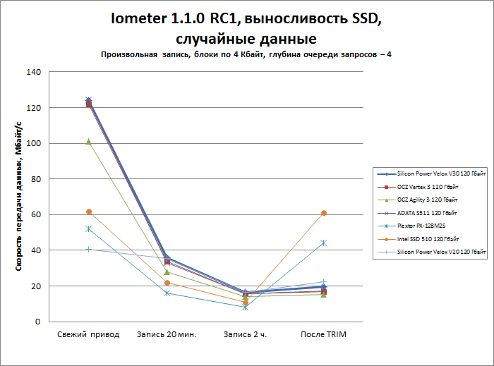 Производительность твердотельного привода падает по мере его заполнения данными. Сохранять форму накопителю помогают компрессия данных и алгоритмы удаления «мусорных» данных. Для оценки эффекта от этих мер мы с помощью Iometer в течение 30 минут бомбардируем накопитель произвольными запросами на запись блоков по 4 Кбайт с глубиной очереди 32. Данные для записи генерируются случайным образом, чтобы затруднить компрессию, которую может выполнять контроллер. Затем процедура продляется еще на полтора часа. У свежего привода и после обоих циклов заполнения измеряется скорость произвольной записи 4-килобайтных блоков при глубине очереди в 4 запроса, с использованием как повторяющихся, так и случайных данных.
