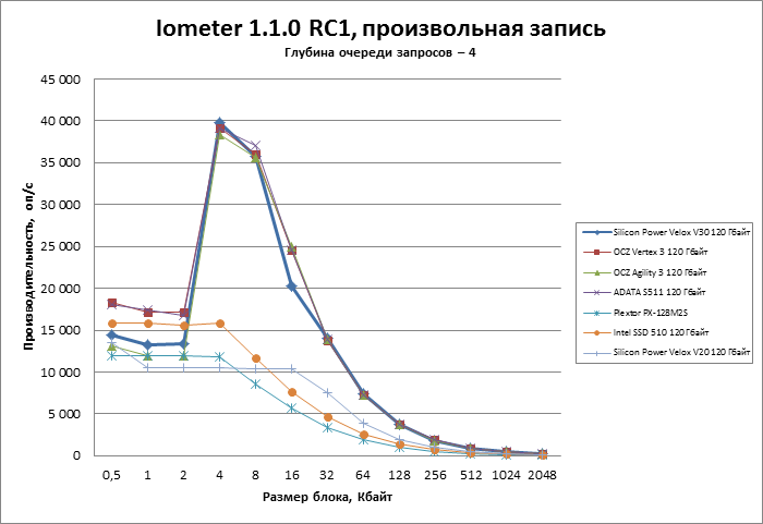 | Скорость произвольной записи (блоки по 4 Кбайт), оп/с | До 80 000 | До 85 000 | До 85 000 | До 40 000 |