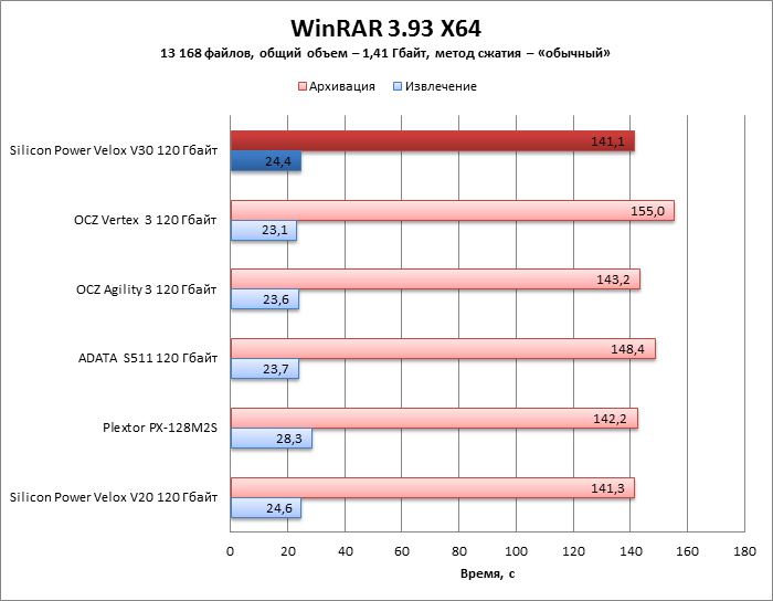 Для того чтобы оценить быстродействие диска при работе с архиватором, пакет файлов Windows из предыдущего теста, скопированный на первый (от «начала» диска) раздел подопытного накопителя, упаковывается при помощи WinRAR со степенью сжатия по умолчанию. Архив создается на том же разделе, где находятся исходные файлы, а затем распаковывается туда же в отдельный каталог. Измеряется время выполнения каждой операции.