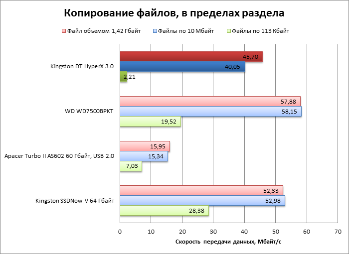 Тестовая нагрузка заключается в копировании набора файлов в пределах раздела NTFS объемом 16 Гбайт с размером кластера по умолчанию. Измеряется время выполнения каждой операции и вычисляется средняя скорость передачи данных.