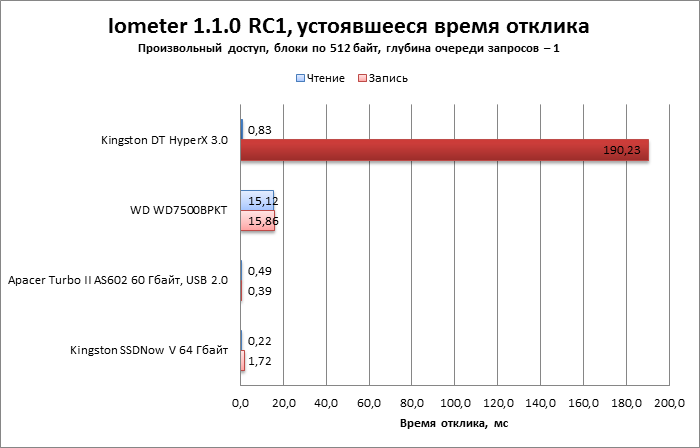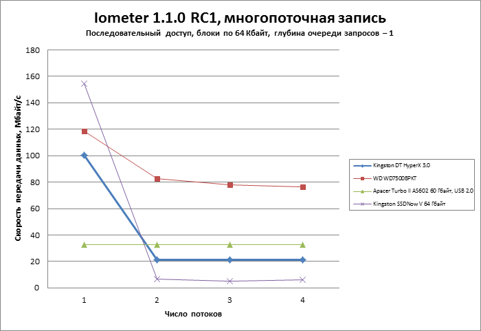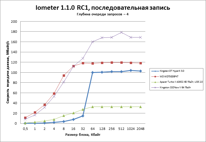 Пресс-служба Kingston представила DataTraveler HyperX 3.0 как самую вместительную и быструю флешку с интерфейсом USB 3.0. Похоже, что так оно и есть: по скорости линейного чтения и записи флешка сравнима с быстрыми жесткими дисками. Для передачи крупных файлов большего и не требуется. Произвольное чтение здесь в несколько раз быстрее, чем на HDD, что роднит DataTraveler HyperX 3.0 с полноценными твердотельными накопителями. Единственное слабое место — скорость произвольной записи: коллекция мелких файлов (около 100 Кбайт) копируется на флешку очень медленно. Ну и цена, конечно же, больно кусается.
