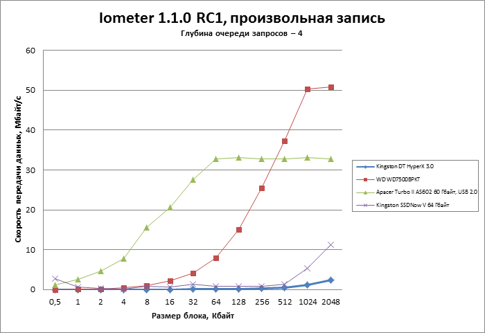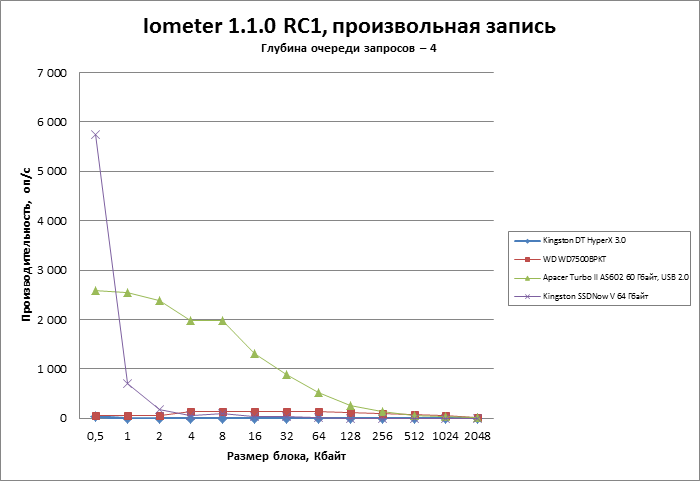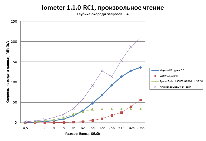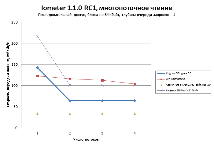Рекордной производительности от Kingston DT XyperX 3.0 мы не ждем. Главное, чтобы флешка оказалась быстрее, чем стандартный жесткий диск (в этом качестве мы использовали Western Digital WD7500BPKT — HDD форм-фактора 2,5 дюйма со скоростью вращения шпинделя 7200 об/мин). Также интересно сравнить флешку с мобильными накопителями и адаптерами для интерфейса USB 2.0. От этой категории выступит SSD Apacer Turbo II AS602 в своем фирменном USB-боксе. И задача максимум — сравняться с недорогим и довольно старым SSD серии Kinsgton SSDNow V.