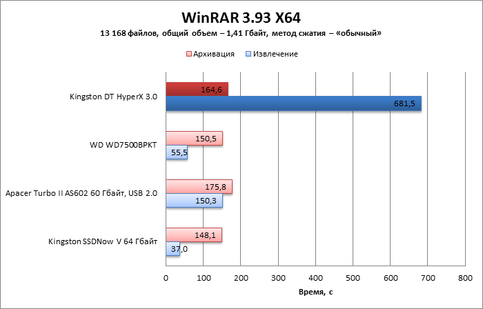 Для того чтобы оценить быстродействие диска при работе с архиватором, пакет файлов Windows из предыдущего теста упаковывается при помощи WinRAR со степенью сжатия по умолчанию. Архив создается на том же разделе, где находятся исходные файлы, а затем распаковывается туда же в отдельный каталог. Измеряется время выполнения каждой операции.