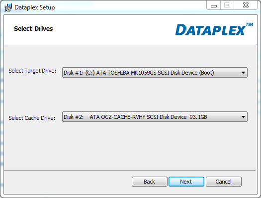 А вот принцип работы уже совсем другой. Дело в том, что SuperScale не обучен распределять данные между SSD и жестким диском, и после установки драйвера в системе появляется собственно винчестер и отдельно — массив SSD, а чтобы объединить их, требуется специальный софт. Для этой цели OCZ лицензировала у компании NVELO (стартап из Кремниевой долины, для которого OCZ, судя по всему, является единственным партнером) программу Dataplex, и к накопителю прилагается индивидуальный ключ. После установки нужно указать SSD в нехитром интерфейсе программы, и дальше он будет использоваться в качестве кеша. Dataplex будет наблюдать за обращениями к жесткому диску и помещать в кеш те данные, которые запрашиваются наиболее часто.