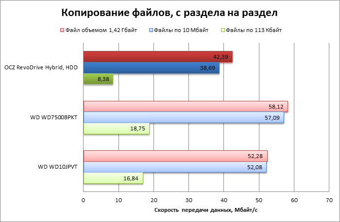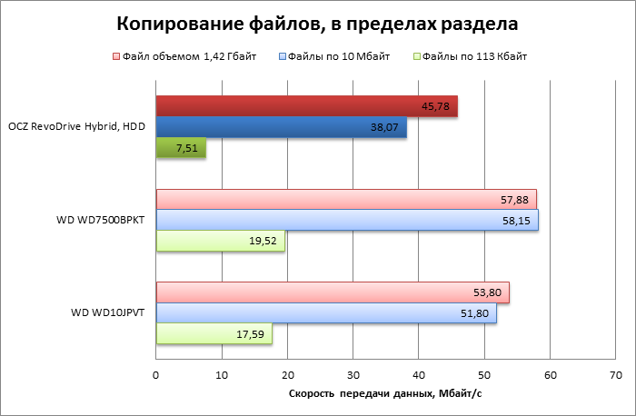• По скорости копирования файлов любого размера диск HD Hybrid сильно уступает обоим своим соперникам. Разница особенно велика при копировании мелких файлов.