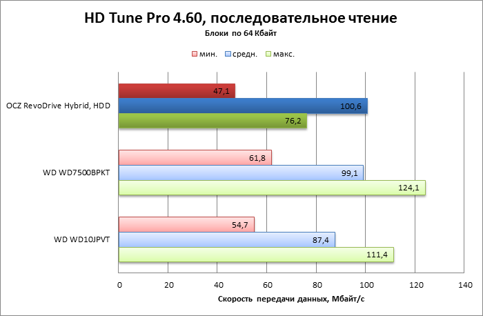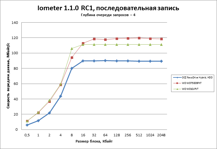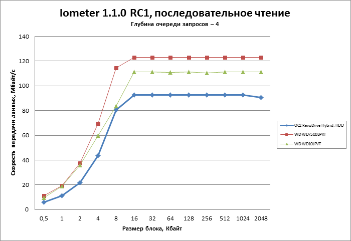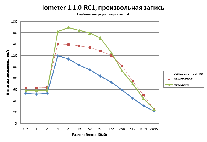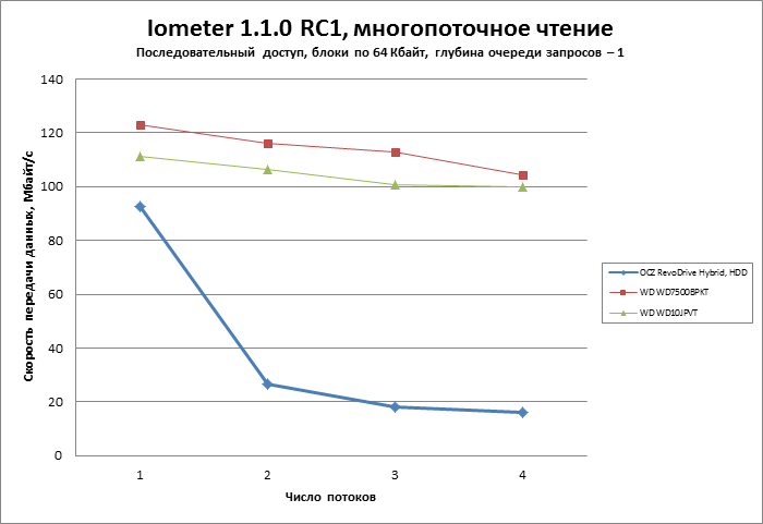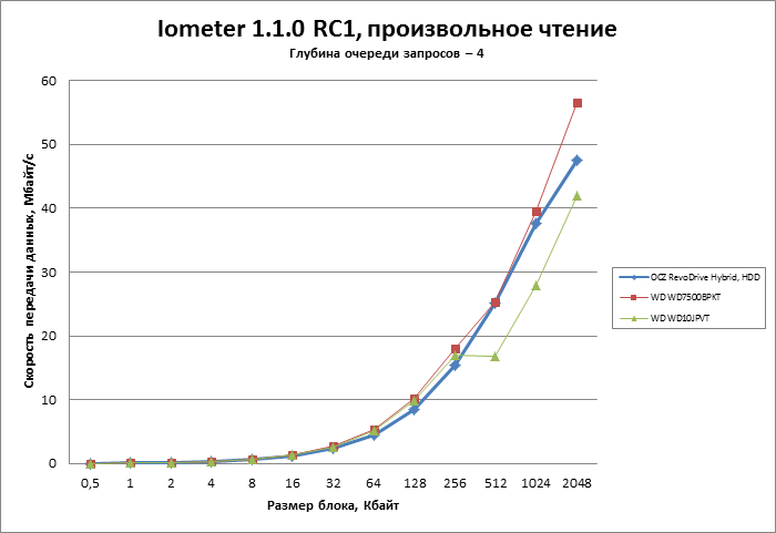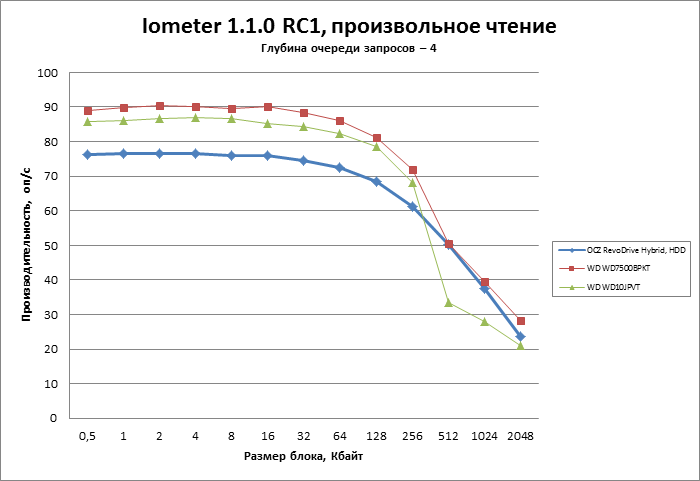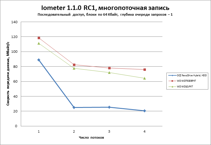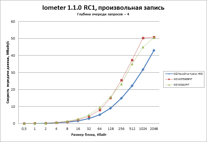 • В Iometer при полноценной нагрузке RD Hybrid сильно уступает и «зеленому» конкуренту, и модели WD750BPKT в обоих тестах: на чтение и на запись.