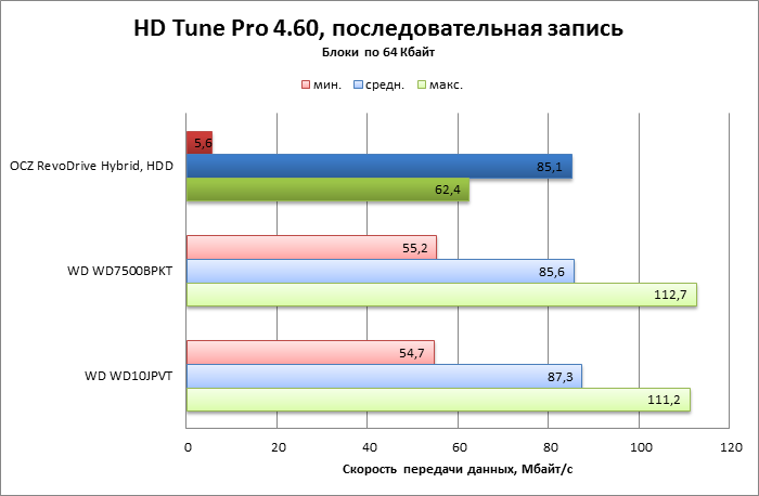 • Скорость записи диска RD Hybrid находится на уровне «семитысячника». «Зеленый» терабайтник WD WD10JPVT чуть-чуть быстрее.