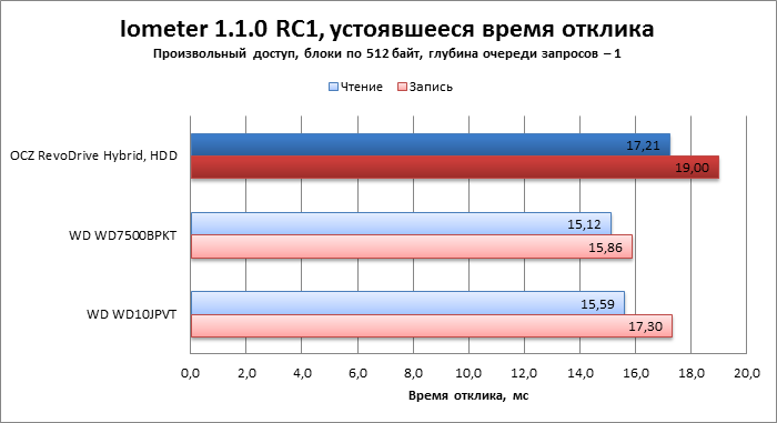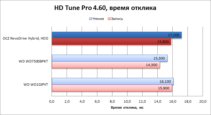 • Время отклика диска RD Hybrid при чтении немного выше, чем у WD10JPVT. При записи результаты двух HDD очень близкие.