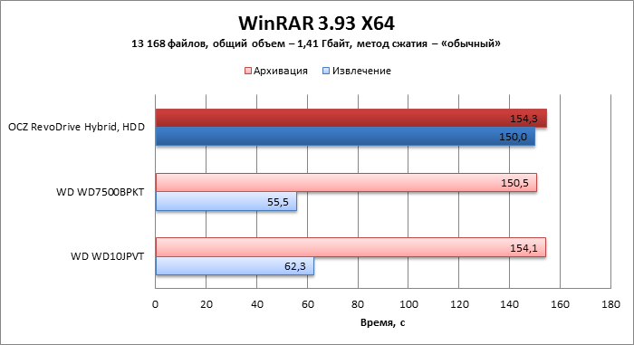 • Низкая скорость при работе с мелкими файлами сказывается на результатах жесткого диска RD Hybrid в тесте WinRAR: для распаковки архива требуется почти в три раза больше времени, чем в случае с WD7500BPKT.