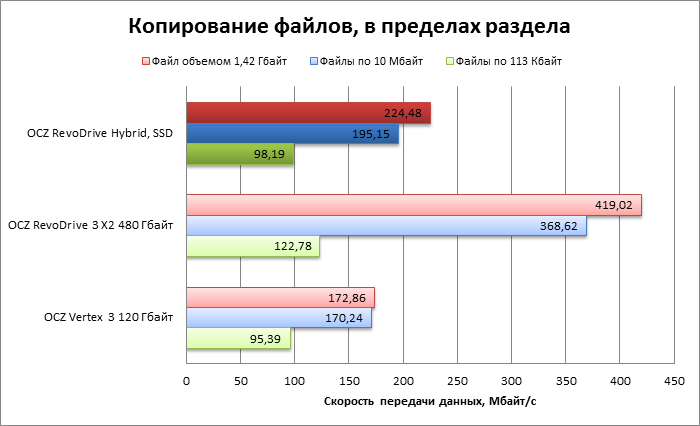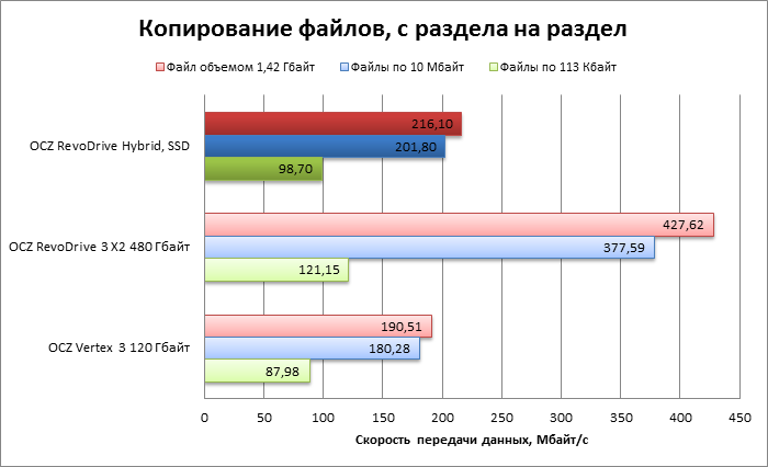 • В этом тесте RD Hybrid оказался медленнее всех прочих моделей RevoDrive и уступает даже накопителю для интерфейса SATA 3 — Vertex 3.