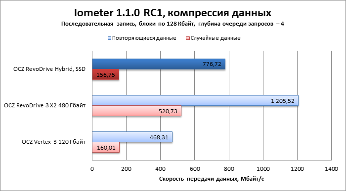 5. Компрессия данных. Сравнивается скорость линейной записи блоков по 128 Кбайт с глубиной очереди в четыре запроса, с одной стороны — при использовании повторяющихся данных, с другой — с данными, выбранными случайным образом. Случайные данные мало подвержены сжатию, и этот тест показывает, какой бонус к производительности дает компрессия тем накопителям, в которых она применяется.