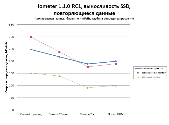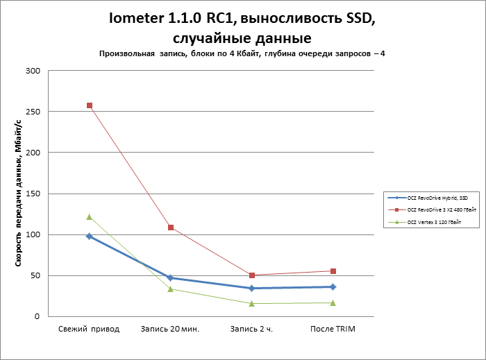 Производительность твердотельного привода падает по мере его заполнения данными. Сохранять форму накопителю помогают компрессия данных и алгоритмы удаления «мусорных» данных. Для оценки эффекта от этих мер мы с помощью Iometer в течение 30 минут бомбардируем накопитель произвольными запросами на запись блоков по 4 Кбайт с глубиной очереди 32. Данные для записи генерируются случайным образом, чтобы затруднить компрессию, которую может выполнять контроллер. Затем процедура продляется еще на полтора часа. У свежего привода и после обоих циклов заполнения измеряется скорость произвольной записи 4-килобайтных блоков при глубине очереди в 4 запроса, с использованием как повторяющихся, так и случайных данных.