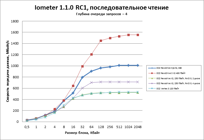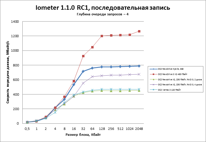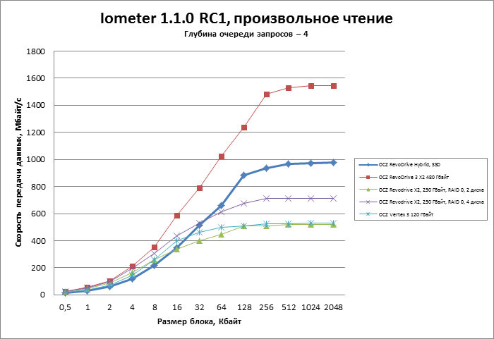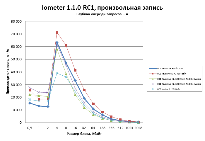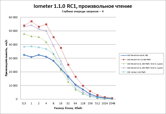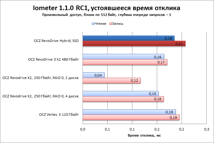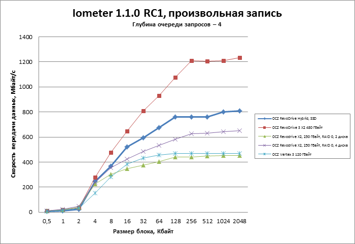 • При серьезной нагрузке с очередью в четыре запроса Hyrbid демонстрирует огромное преимущество перед первыми версиями RevoDrive.