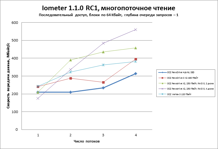4. Многопоточная нагрузка. В ходе этого теста с диском одновременно работают от одной до четырех копий тестовой утилиты (workers, в терминологии Iometer), выполняющих последовательное чтение (запись) блоков данных размером 64 Кбайт с глубиной очереди запросов, равной единице. Каждая копия имеет доступ к данным в отдельном адресном пространстве объемом 16 Гбайт. Адресные пространства расположены в объеме диска вплотную друг к другу, начиная с нулевого сектора. Измеряется совокупная производительность всех копий тестовой утилиты.