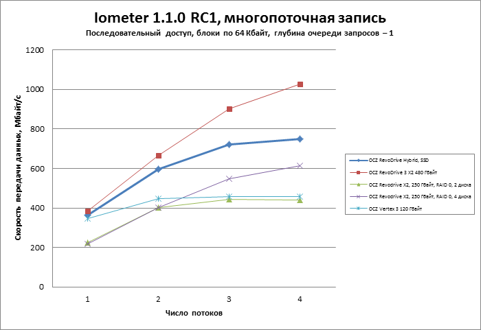 • При записи данных у RD Hybrid более активная динамика, чем в тесте на чтение. Лучший результат при нескольких потоках показал только RevoDrive 3 X2.