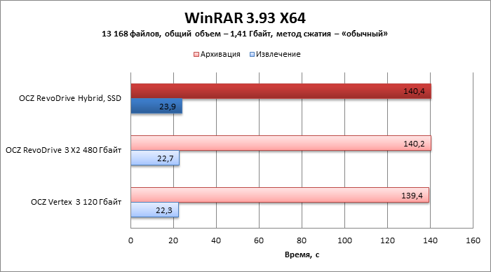 • При создании и распаковке архивов RD Hybrid оказался чуть-чуть медленнее моделей RevoDrive 3 X2 и Vertex 3.
