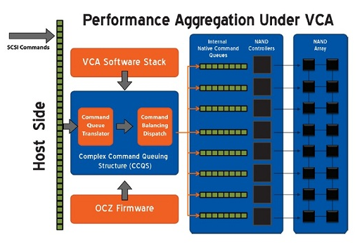 Но если производителям жестких дисков комбинированные накопители по-прежнему не интересны, то можно перекинуть мостик со стороны SSD, что и сделала OCZ, известный новатор. RevoDrive Hybrid — не такой гибрид, как Seagate Momentus XT, это плата с интерфейсом PCI-E 2.0 x4, на которой смонтирован терабайтный HDD и два контроллера SandForce SF-2281 со своей Flash-памятью. Чипы SandForce объединены в массив при помощи фирменного SAS-контроллера SuperScale с архитектурой VCA.