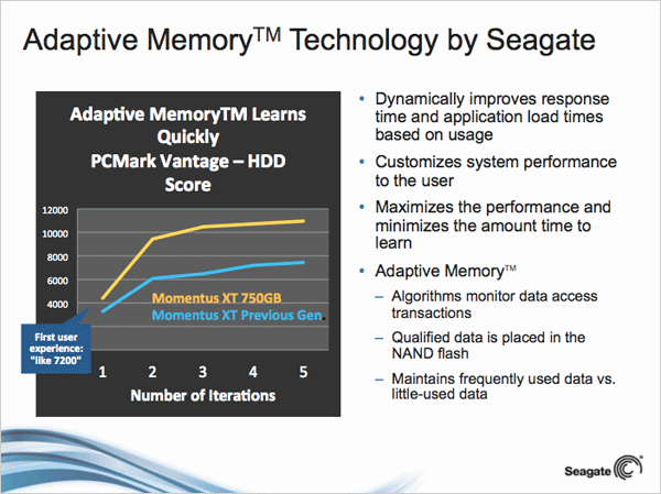 Как бы то ни было, Seagate затем пошла своим путем и на основе старых наработок создала собственную закрытую архитектуру. В Momentus XT используется достаточно мощный процессор, который выбирает данные для кеширования вслепую, на основе паттерна доступа к логическим блокам диска. Seagate называет это технологией Adaptive Memory. Чем чаще повторяется определенная операция высокого уровня (запуск программы, загрузка карты в игре, открытие файлов), тем больше данных, связанных с ней, копируется в кеш (производитель утверждает, что максимальная скорость достигается с третьего раза). Причем именно копируется, так что потеря данных по причине сбоя SSD исключается. Сам кеш довольно мелкий: 4 Гбайт у Momentus XT объемом 500 Гбайт и 8 Гбайт у новой модели, поэтому его содержимое при активной и разнообразной нагрузке на HDD быстро обновляется, хотя компьютерам типа «печатная машинка + органайзер», в качестве которых часто выступают ноутбуки, 8 Гбайт должно хватить для того, чтобы закешировать все ходовые данные.