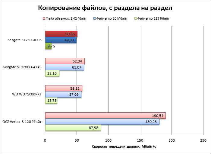 Тестовая нагрузка заключается в копировании набора файлов в пределах раздела, а затем — на соседний раздел. Измеряется время выполнения каждой операции и вычисляется средняя скорость передачи данных.