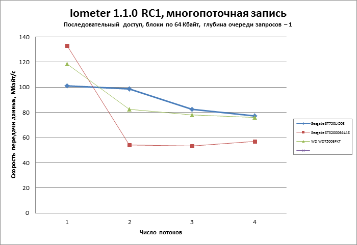 В этой группе бенчмарков в состав соперников включен один из самых быстрых SSD, которые можно купить за такие же деньги, что и Momentus XT, — OCZ Vertex 3. Обратите внимание, что в этих тестах из нашей стандартной методики тоже нет предсказуемого паттерна произвольного чтения, поэтому кеширование Momentus XT в них не работает, и результаты отражают производительность самой «банки» жесткого диска.