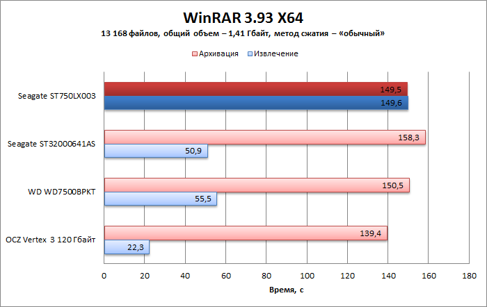 Для того чтобы оценить быстродействие диска при работе с архиватором, пакет файлов Windows из предыдущего теста, скопированный на первый (от «начала» диска) раздел подопытного накопителя, упаковывается при помощи WinRAR со степенью сжатия по умолчанию. Архив создается на том же разделе, где находятся исходные файлы, а затем распаковывается туда же в отдельный каталог. Измеряется время выполнения каждой операции.