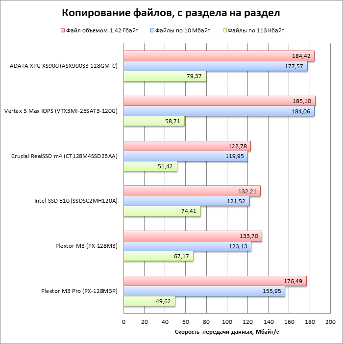 У контроллеров Marvell, как и у SandForce, есть свое слабое место: скорость последовательной записи, которая сильно зависит от объема диска. Даже модели с быстрой памятью объемом 256 Гбайт уступают по этому параметру SSD на SandForce, а в той весовой категории, которая нас сейчас интересует, производительность еще меньше.