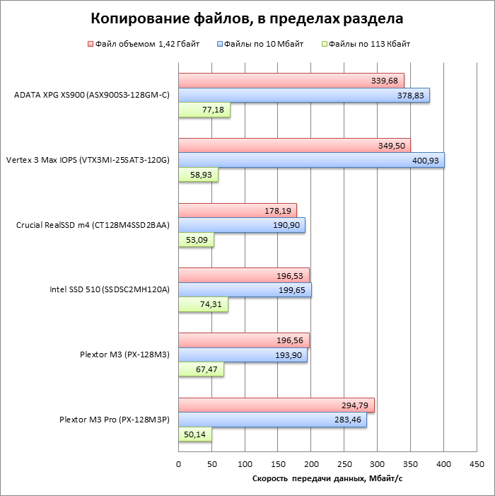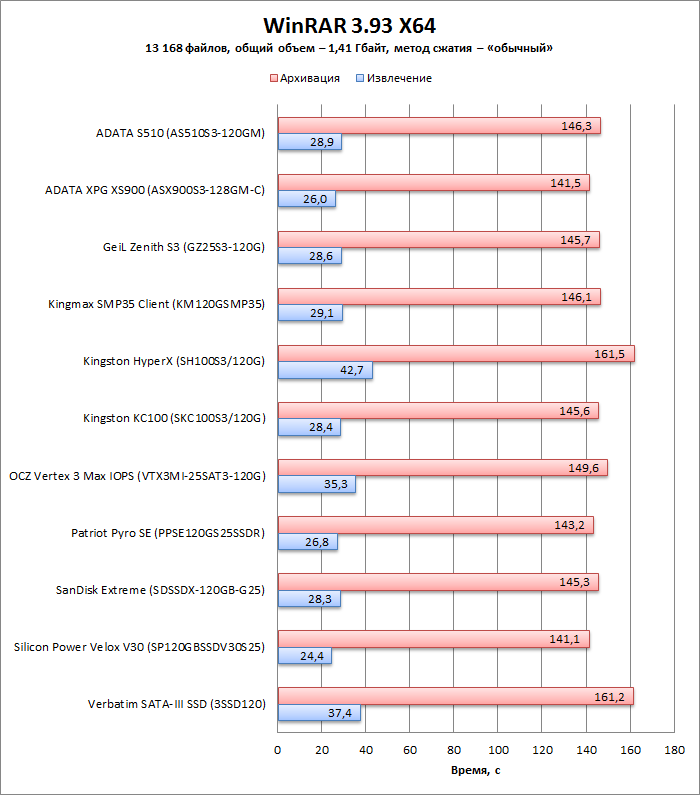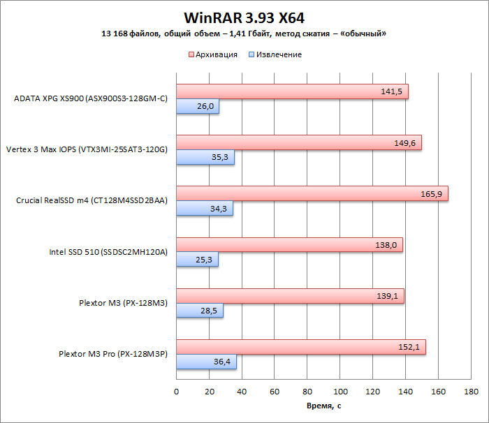 Тестовые пакеты состоят из файлов различного размера: в первом пакете есть только один большой файл, второй пакет включает файлы размером около 10 Мбайт, а в третий входит содержимое каталога System32 операционной системы Windows 7 Ultimate X64 (в двойном объеме — для увеличения надежности теста), которое представляет собой тысячи мелких файлов. Чтобы создать одинаковые условия для накопителей с онлайновой компрессией и без нее, в тестовых пакетах используются данные с одинаковой структурой: файлы большого и среднего объема представляют собой RAR-архивы мелких файлов, созданные без компрессии. В таблице ниже приведены характеристики каждого пакета. Для надежности измерения тест выполняется пять раз, и выбираются средние значения результатов.