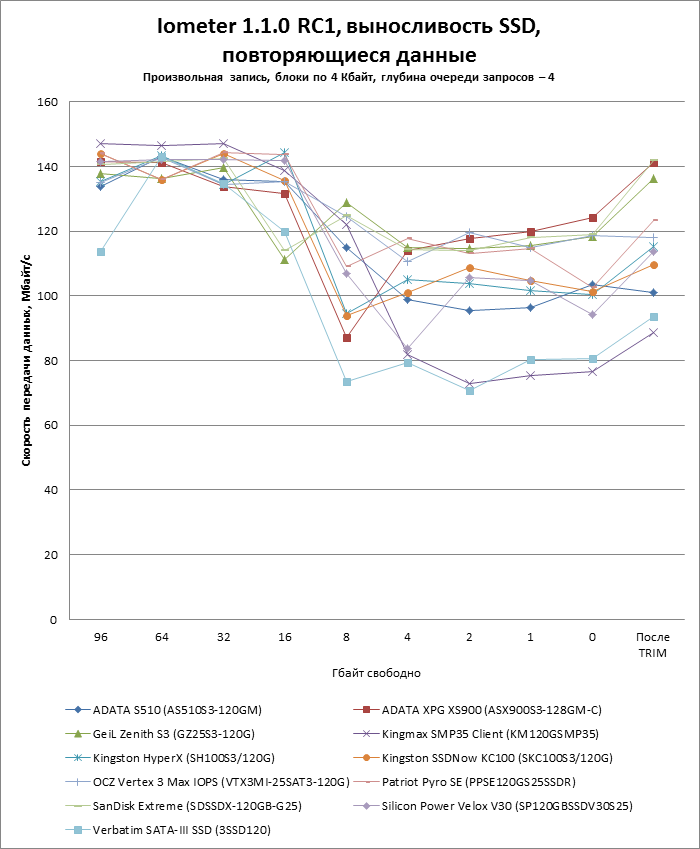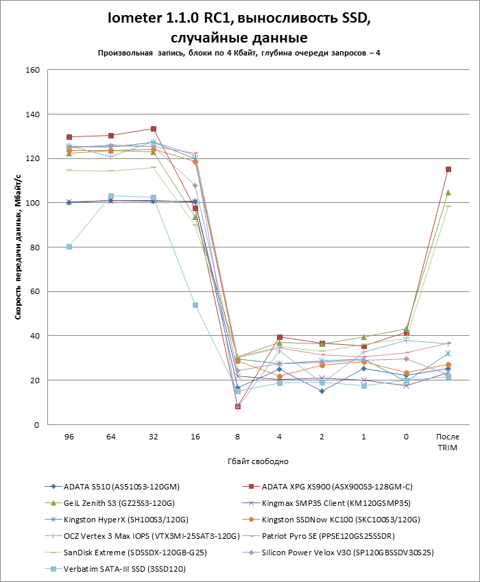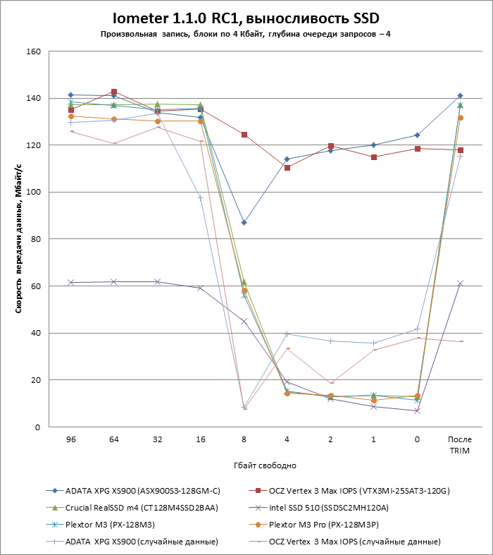 Чтобы проверить, насколько падает скорость записи на SSD по мере заполнения, мы поэтапно забиваем его случайными данными на блочном уровне и проводим с помощью Iometer тесты произвольной записи блоков по 4 Кбайт с глубиной очереди запросов 4. Затем над диск посылается команда TRIM (при помощи утилиты Diskpart создается и форматируется раздел на весь объем диска) и еще раз измеряется скорость записи.