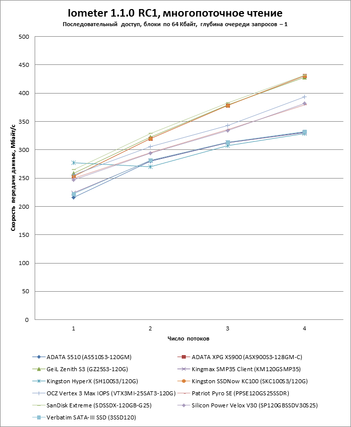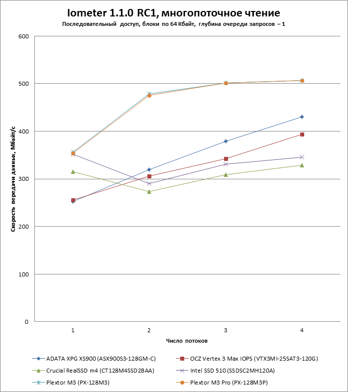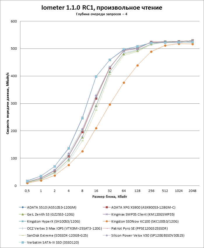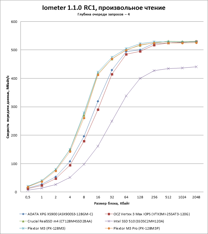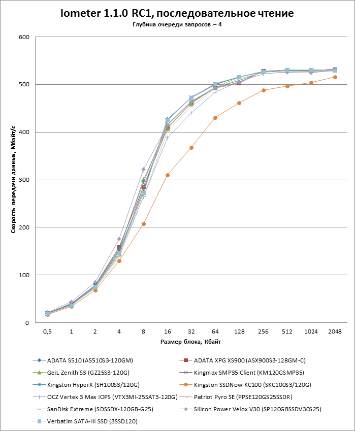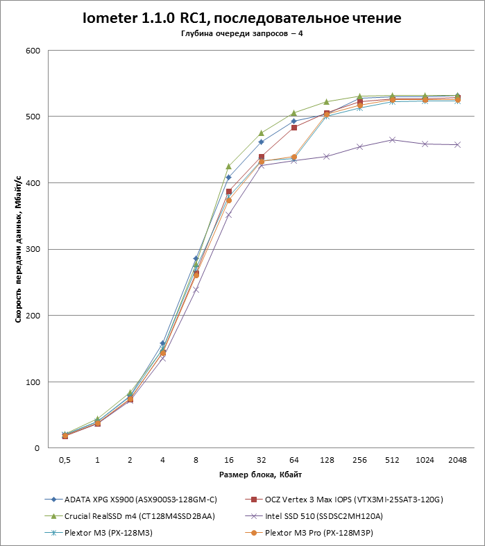 | Макс. скорость последовательного чтения, Мбайт/с | 500 | 450 | 510 | 535 |