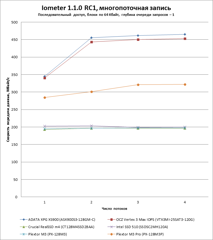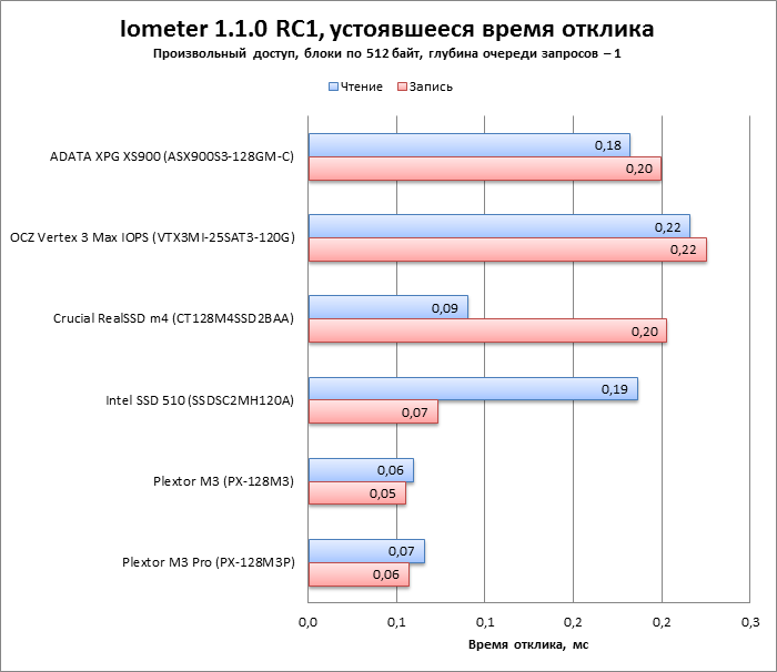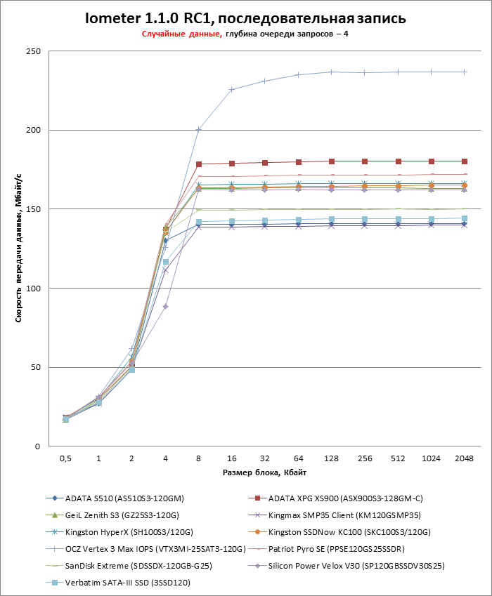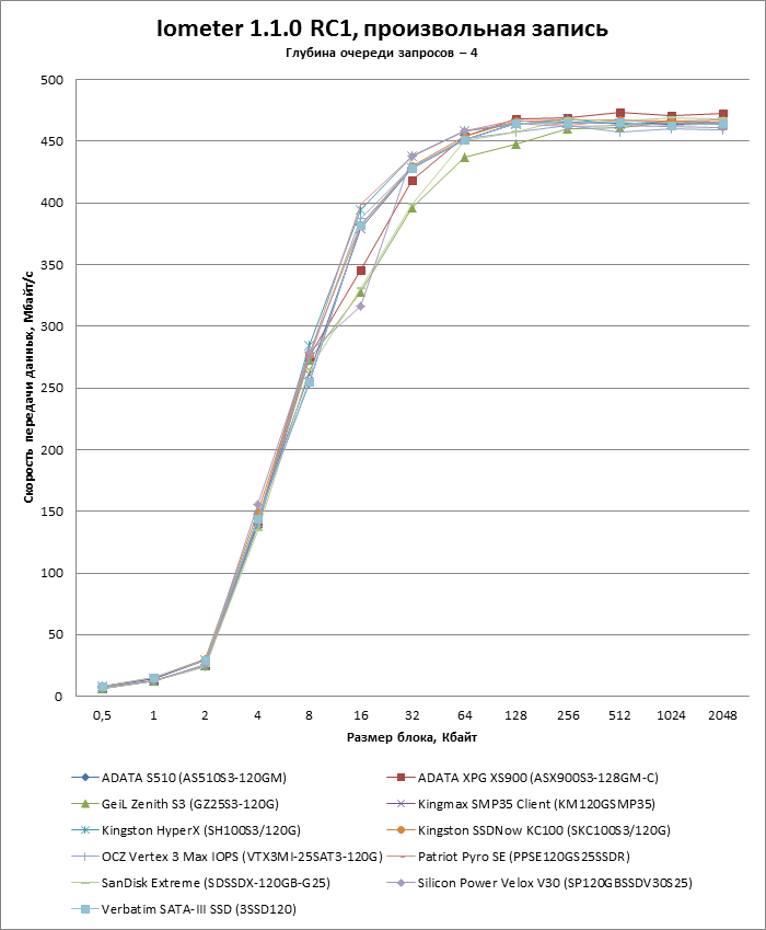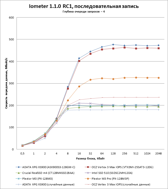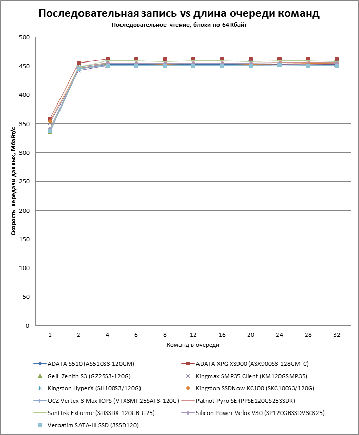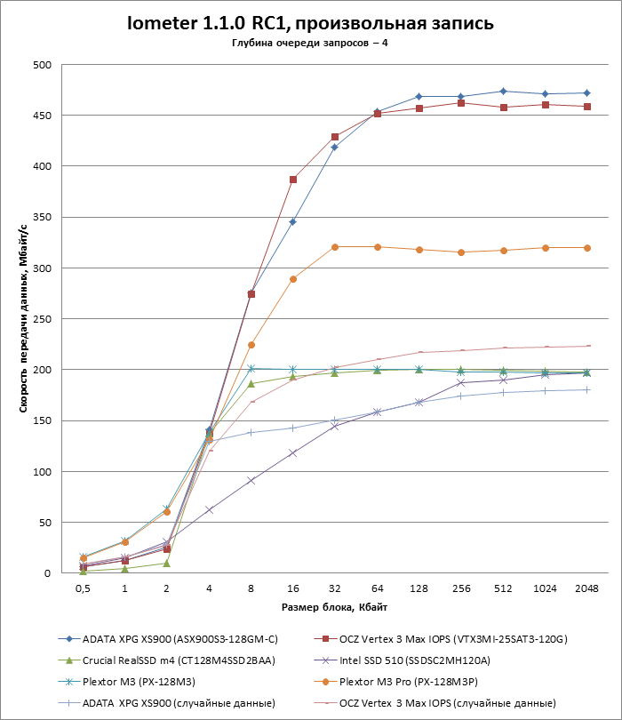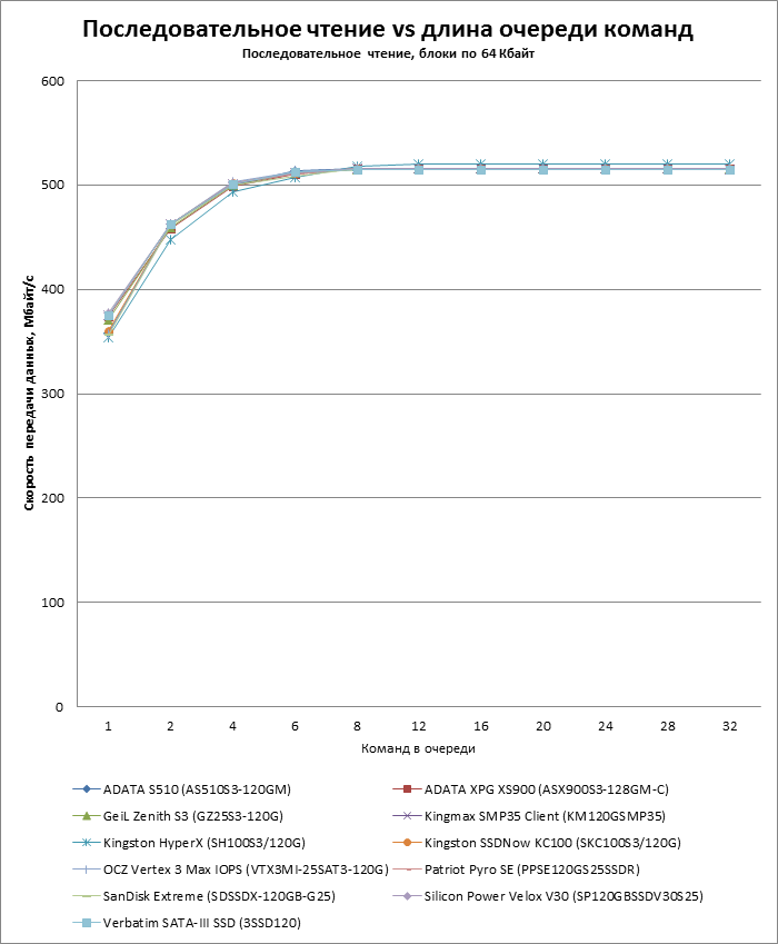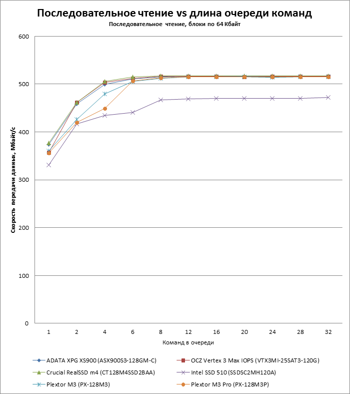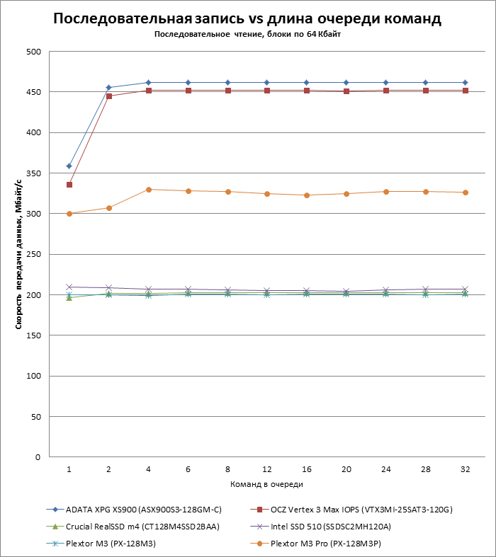 Во-вторых, в батарею включен дополнительный тест, показывающий зависимость скорости чтения и записи от длины очереди запросов. Недавний прецедент с OCZ Vertex 4 показал, что SSD могут испытывать проблемы с наращиванием производительности в пределах длины очереди, характерной для десктопных нагрузок (3-4 запроса), поэтому впредь мы будем тестировать SSD и по этому параметру.