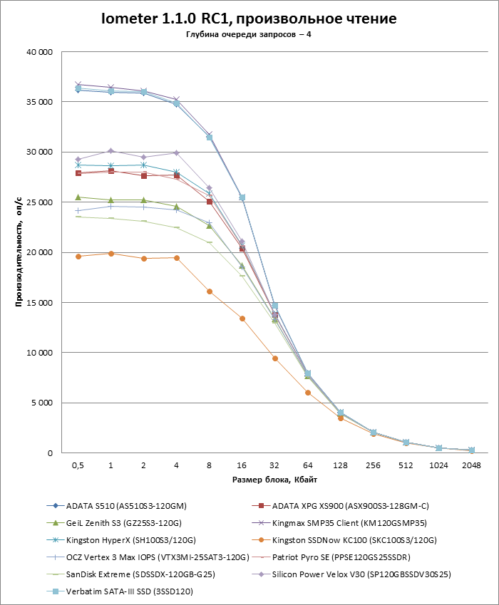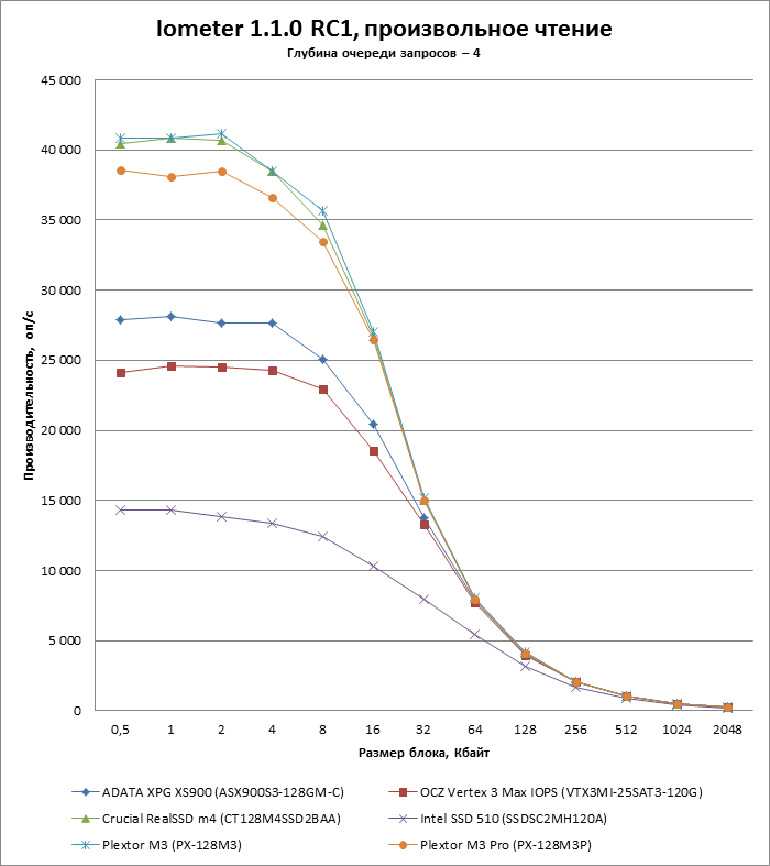 | Макс. скорость произвольного чтения (блоки по 4 Кбайт), оп/с | 45 000 (типичн.) | 20 000 | 70 000 | 75 000 |