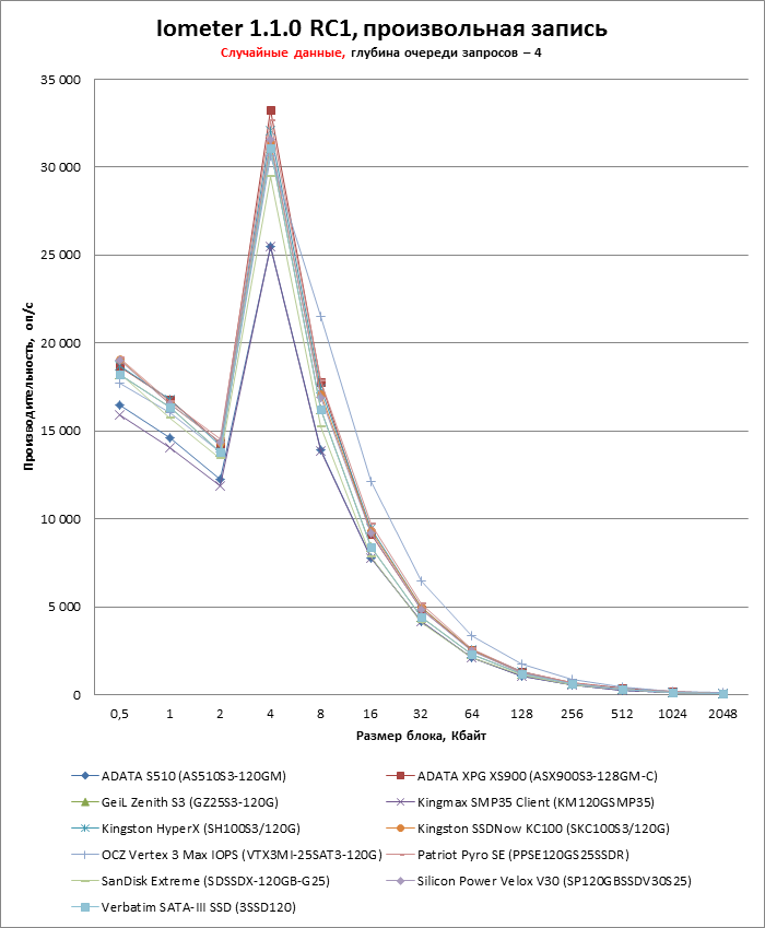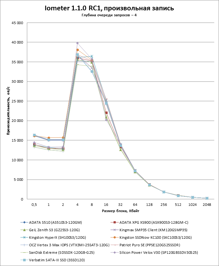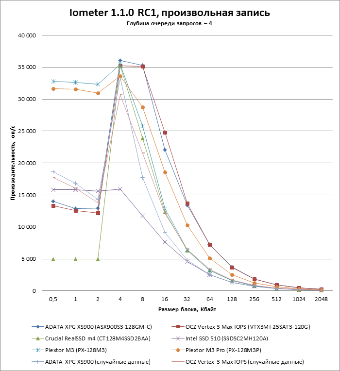 | Макс. скорость произвольной записи (блоки по 4 Кбайт), оп/с | 35 000 (типичн.) | 8 000 | 50 000 | 69 000 |