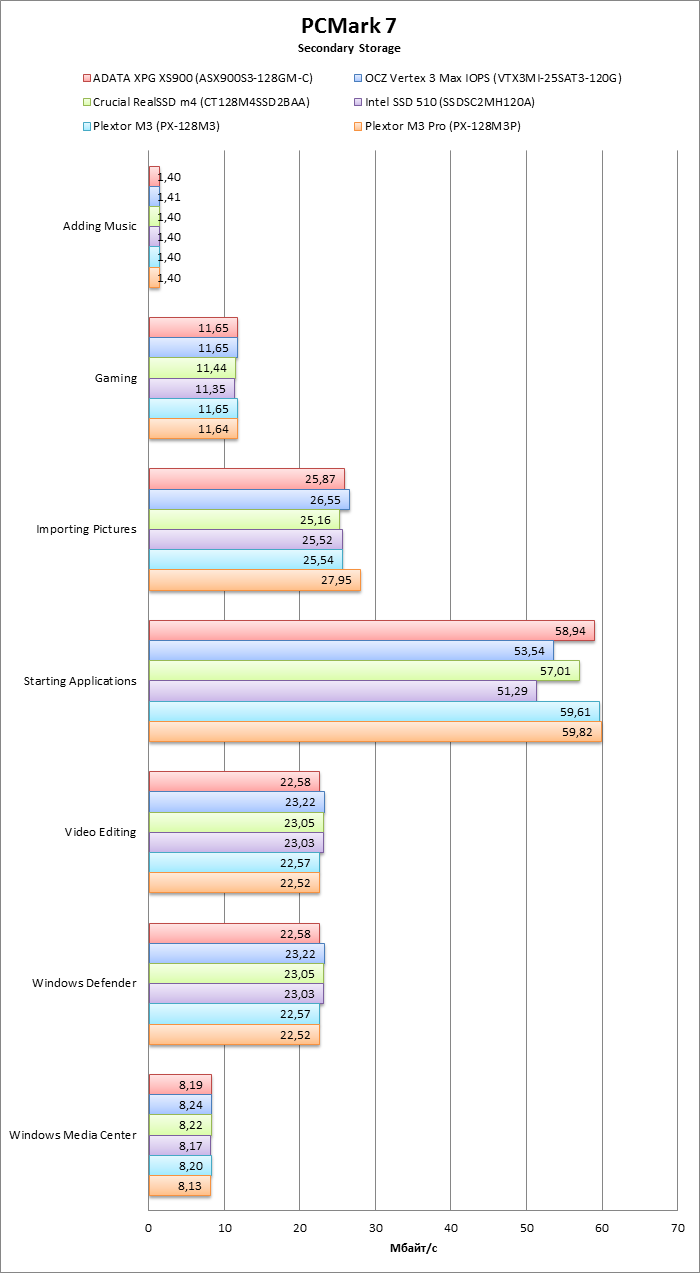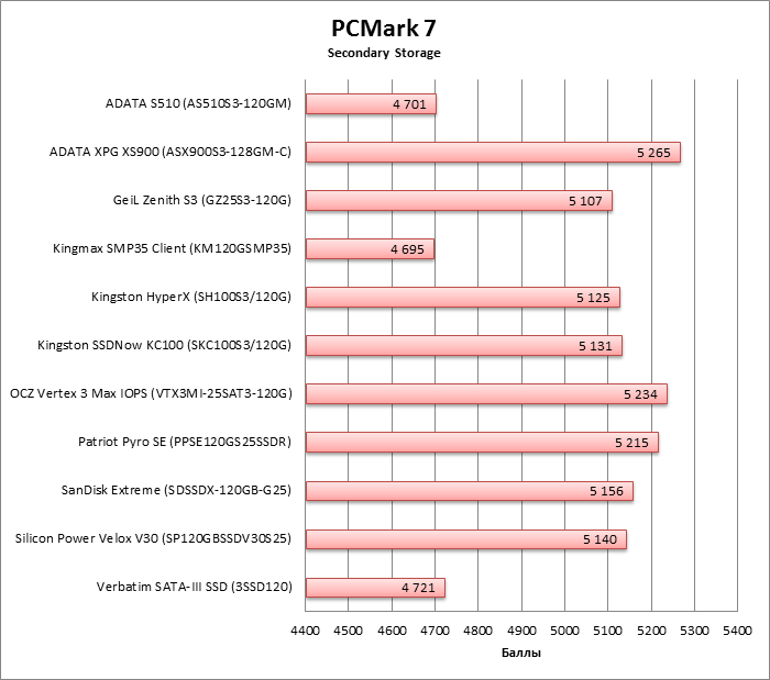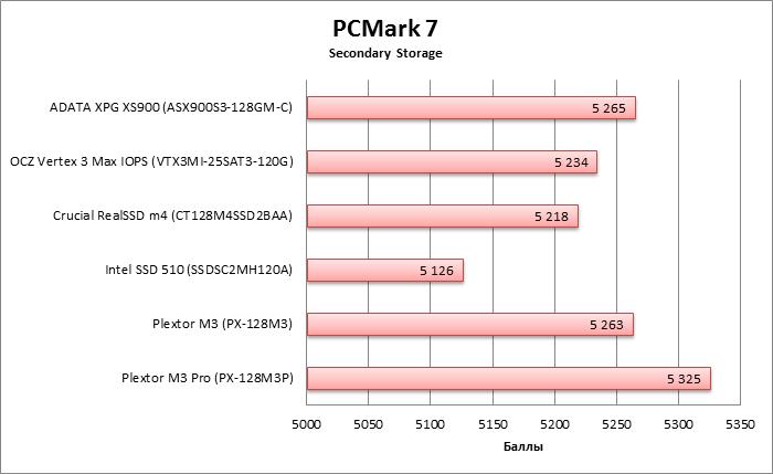 Синтетический тест, эмулирующий нагрузку реальных приложений и различные паттерны использования ресурсов ПК. Бенчмарк установлен на основном накопителе стенда. На тестируемом накопителе создается единственный раздел в файловой системе NTFS на весь доступный объем, и в PCMark 7 проводится тест Secondary Storage. В качестве результатов теста учитывается как итоговый балл, так и скорость выполнения отдельных субтестов.