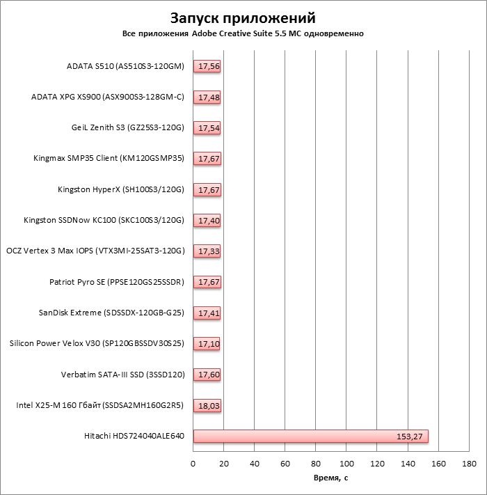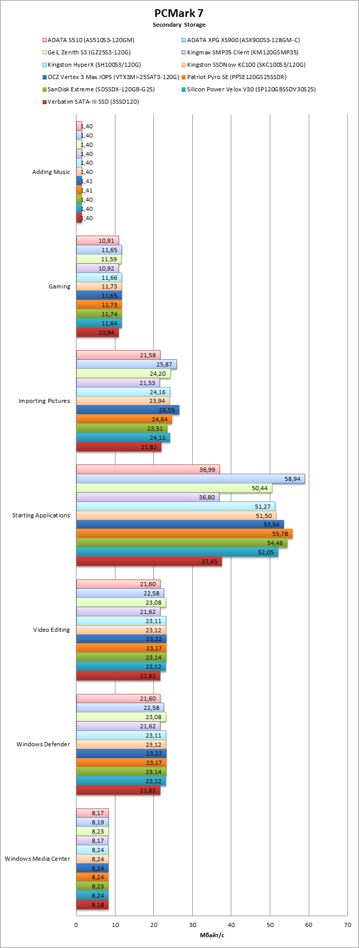 Также есть несколько дисков, отклонявшихся от общих тенденции в худшую сторону. Троица, выдавшая посредственный результат в тестах с реальной нагрузкой: Kingmax SMP35 Client, ADATA S510 и Verbatim SATA-III SSD. А в синтетике необъяснимые провалы раз за разом происходили и с Kingston SSDNow KC100. Остальные участники (GeiL Zenith S3, оба Kingston'а, Patriot Pyro SE, SanDisk Extreme и Silicon Power Velox V30) прошли через тесты с примерно равными результатами.