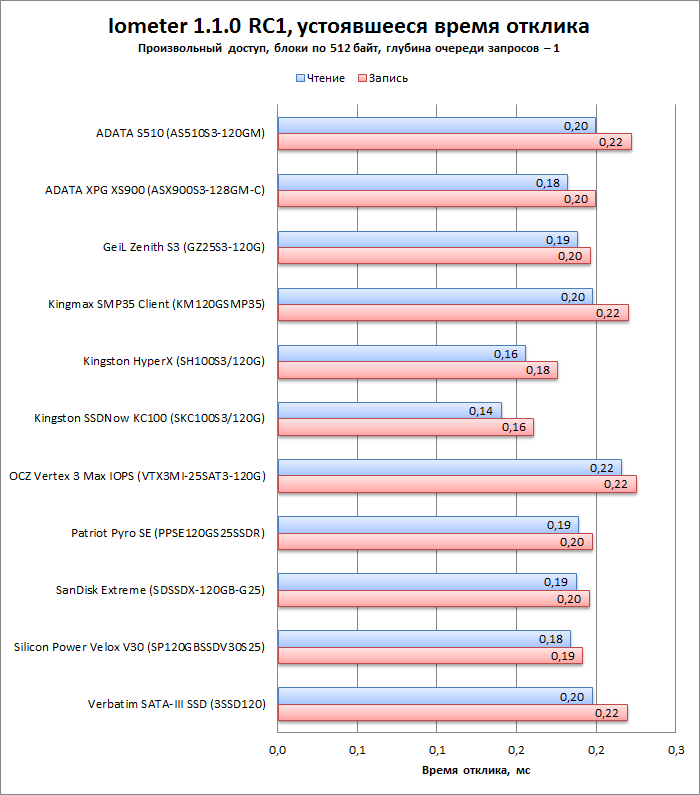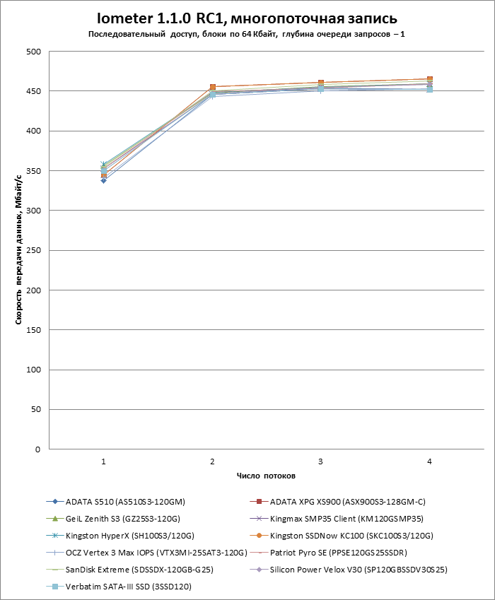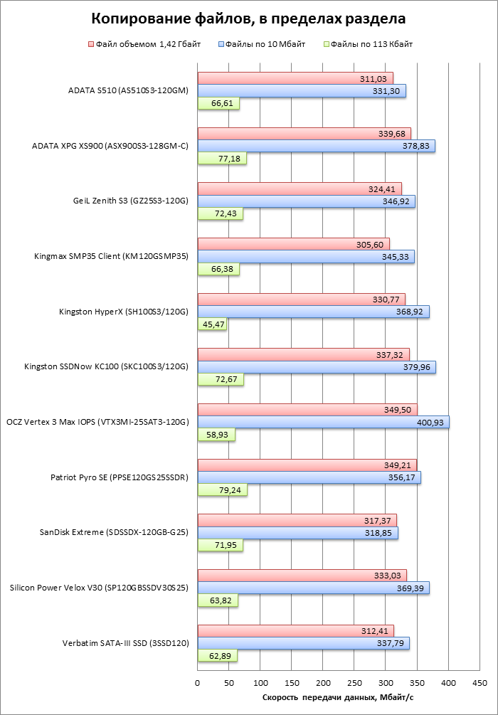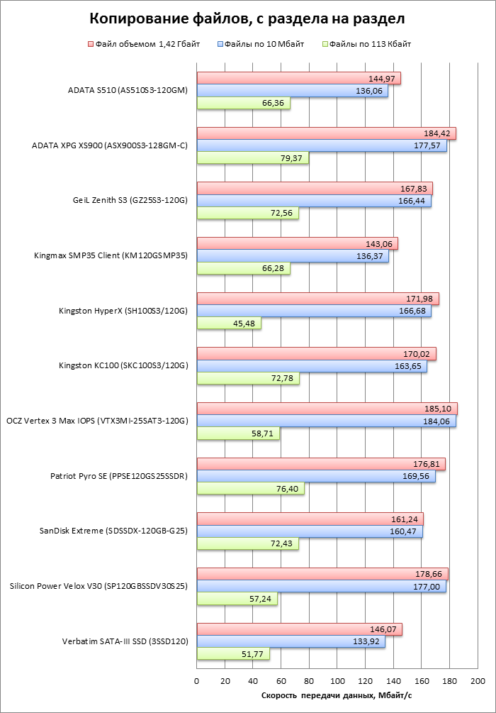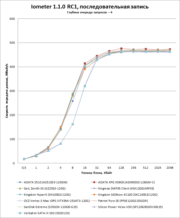 | Модель | ADATA S510 (AS510S3-120GM) | ADATA XPG XS900 (ASX900S3-128GM-C) | GeiL Zenith S3 (GZ25S3-120G) | Kingmax SMP35 Client (KM120GSMP35) | Kingston HyperX (SH100S3/120G) | Kingston SSDNow KC100 (SKC100S3/120G) |