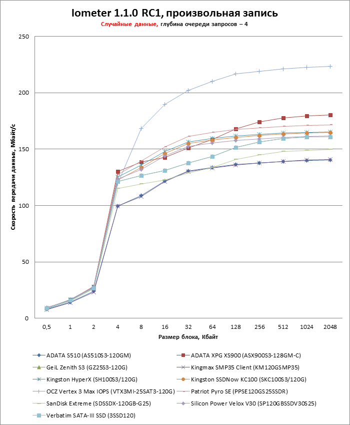 | Модель | OCZ Vertex 3 Max IOPS (VTX3MI-25SAT3-120G) | Patriot Pyro SE (PPSE120GS25SSDR) | SanDisk Extreme (SDSSDX-120GB-G25) | Silicon Power Velox V30 (SP120GBSSDV30S25) | Verbatim SATA-III SSD (3SSD120) |