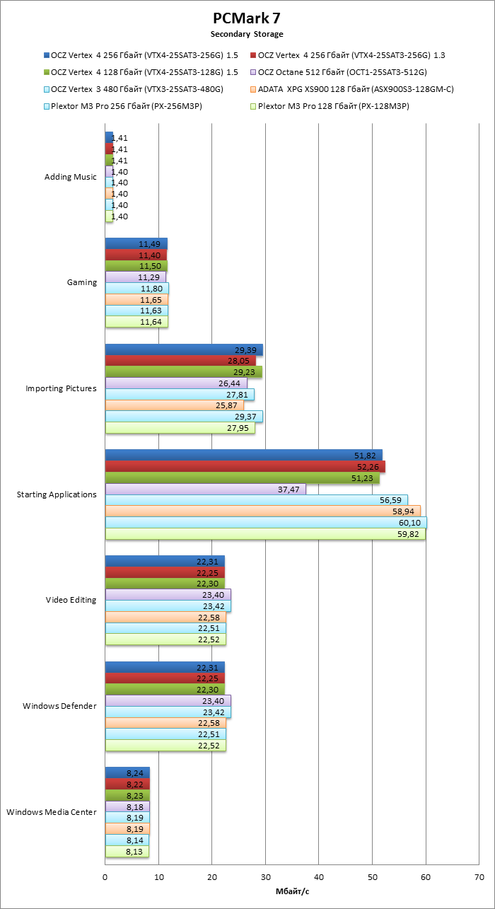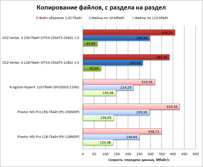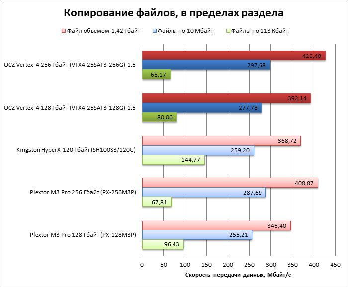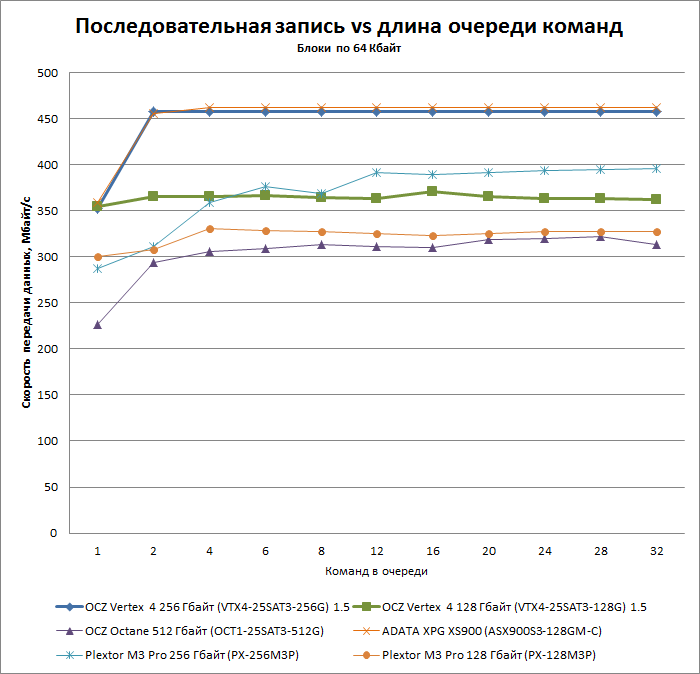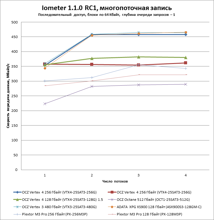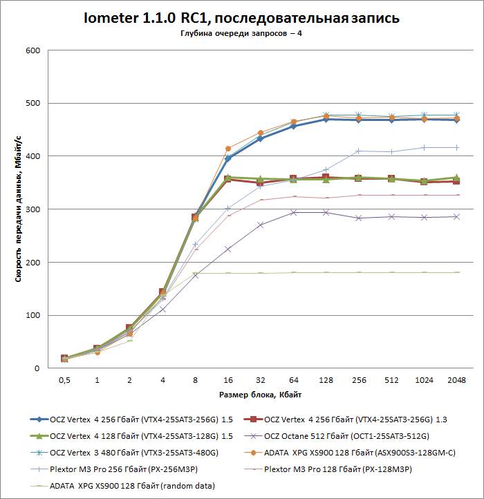 Vertex 4 объемом 128 Гбайт мы тестируем впервые, поэтому просто сравним его с Plextor M3 Pro такого же объема и дисками ADATA XPG SX900 и Kingston HyperX на платформе SandForce SF-2281.