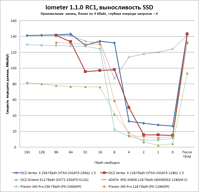 Чтобы проверить, насколько падает скорость записи на SSD по мере заполнения, мы поэтапно забиваем его случайными данными на блочном уровне и проводим с помощью Iometer тесты произвольной записи блоков по 4 Кбайт с глубиной очереди запросов 4. Затем на диск посылается команда TRIM (при помощи утилиты Diskpart создается и форматируется раздел на весь объем диска) и еще раз измеряется скорость записи.