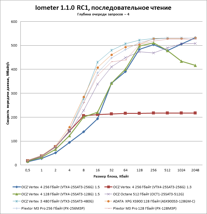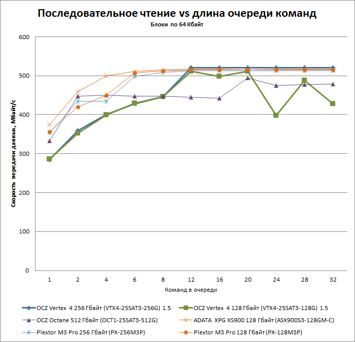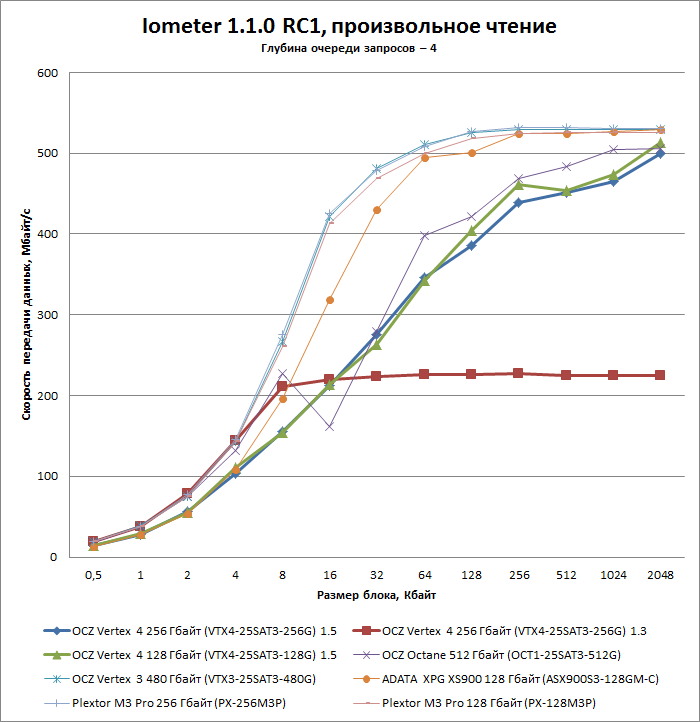 Таким образом, чисто по спецификациям Vertex 4 как по мановению волшебной палочки стал лидером среди SSD для шины SATA 3. Проверим, согласуется ли это с результатами реальных тестов. Кроме того, спецификации ничего не говорят о поведении привода в условиях короткой очереди команд. Решилась ли проблема со скоростью чтения?